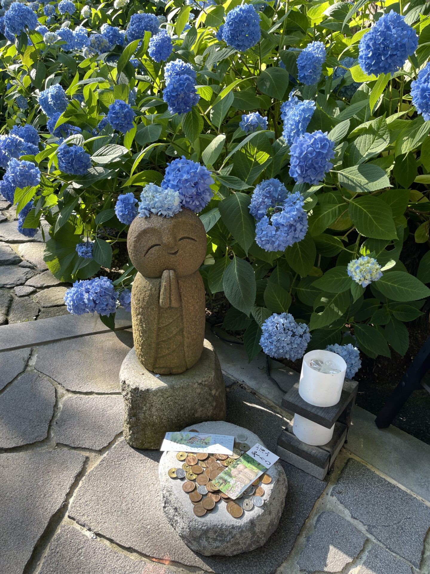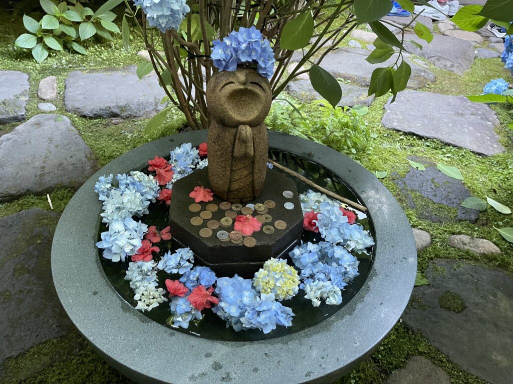 寺社内ではお花に身を包んだかわいらしいニコニコと笑うお地蔵さんと出くわすことがある